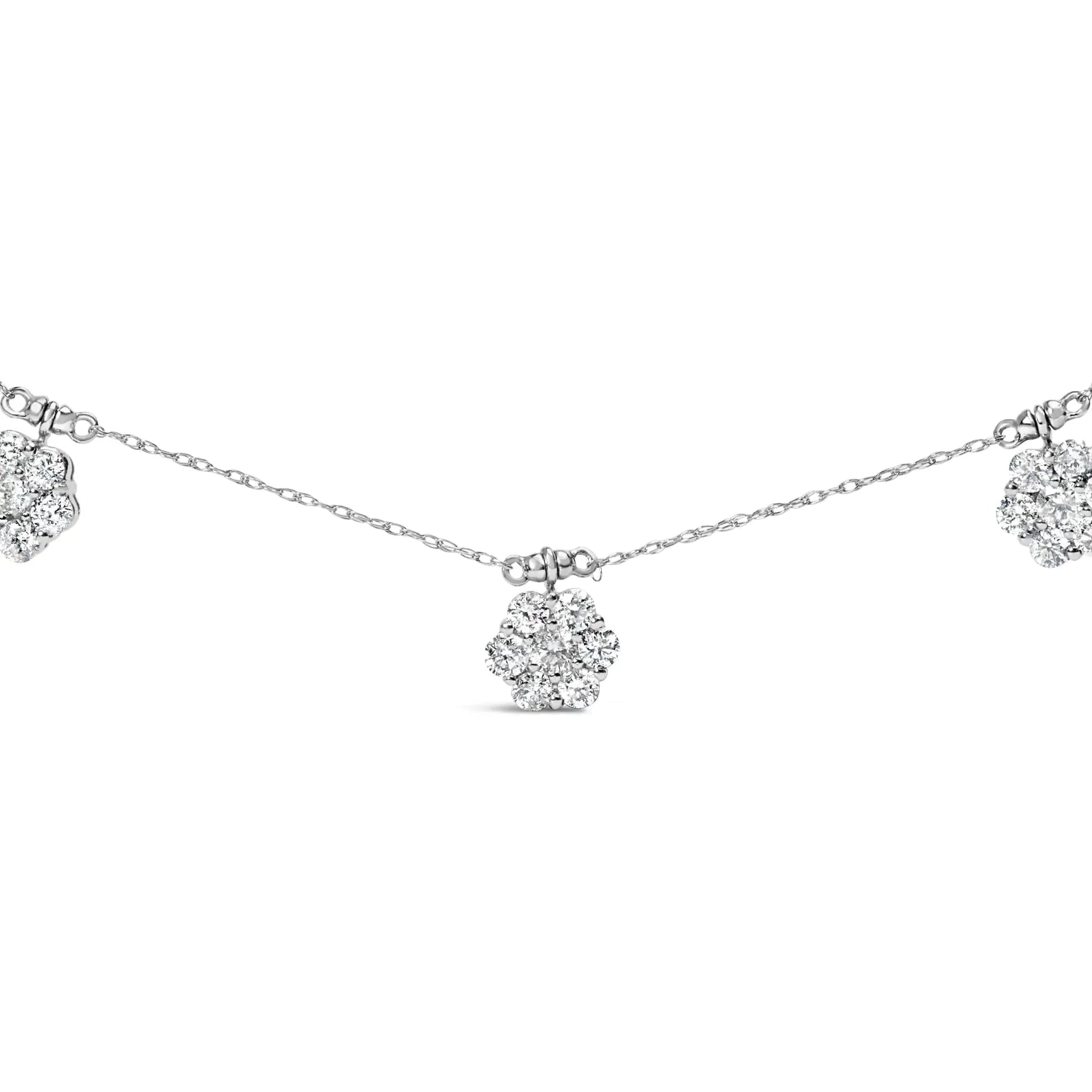 Bring a touch of timeless elegance to your jewelry collection with this exquisite flower station necklace. Crafted from 10K white gold, this stunning piece features 49 round-cut diamonds, totaling 3.0 cttw. These natural diamonds boast a striking H-I color and I1-I2 clarity, and are perfectly set in prongs to ensure maximum light reflection and sparkle. The flower station design of this necklace adds a touch of femininity and sophistication to any outfit, making it the perfect accessory for both formal occasions and everyday wear. The secure spring ring clasp and rolo chain make for a comfortable and secure fit, ensuring you can wear this necklace with confidence. This necklace makes a perfect gift for someone special, or a wonderful treat for yourself. Its classic design and quality craftsmanship will ensure it becomes a cherished addition to your collection for years to come. Don't miss out on the opportunity to own this breathtaking 10K white gold flower station necklace, adorned with 3.0 cttw of stunning round-cut diamonds.