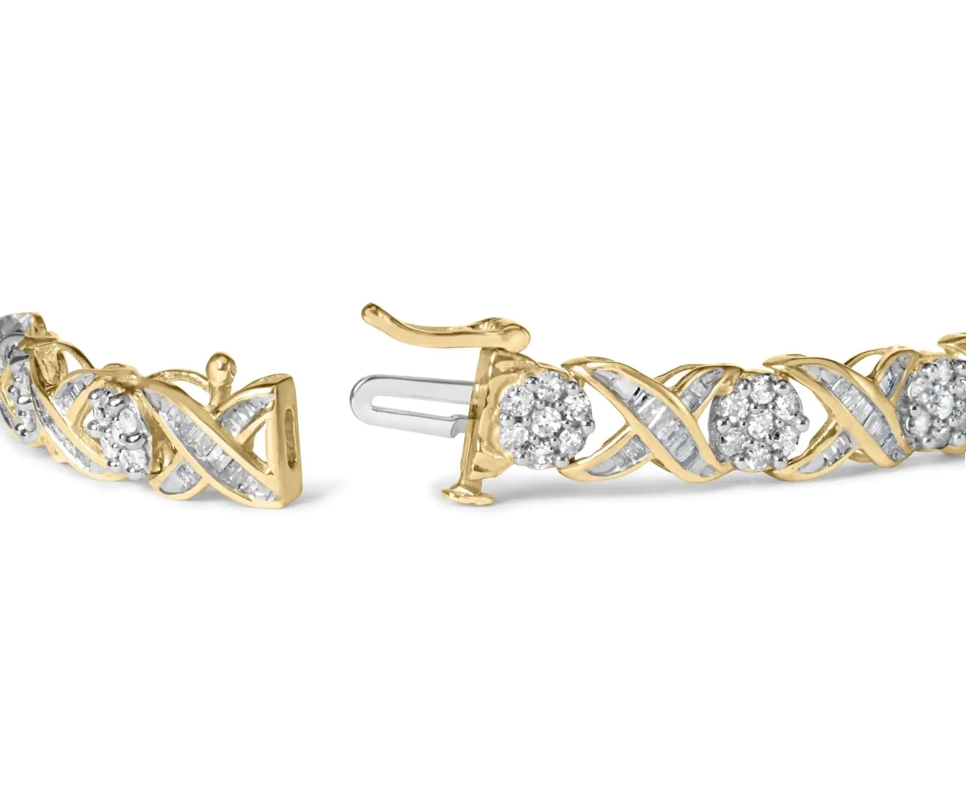 10K Yellow Gold 3.00 Cttw Round-Cut and Baguette-Cut Diamond 'XOXO' Floral Design 7.50" Bracelet (J-K Color, I1-I2 Clarity)