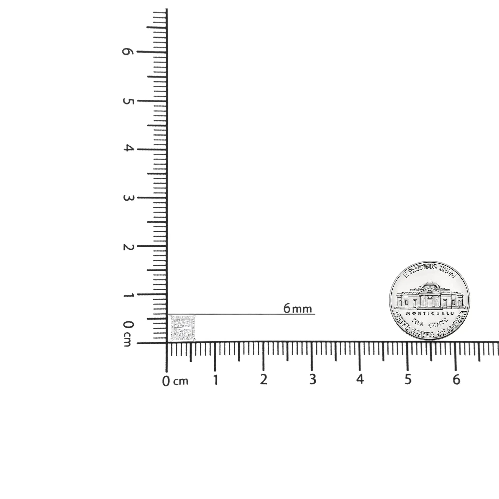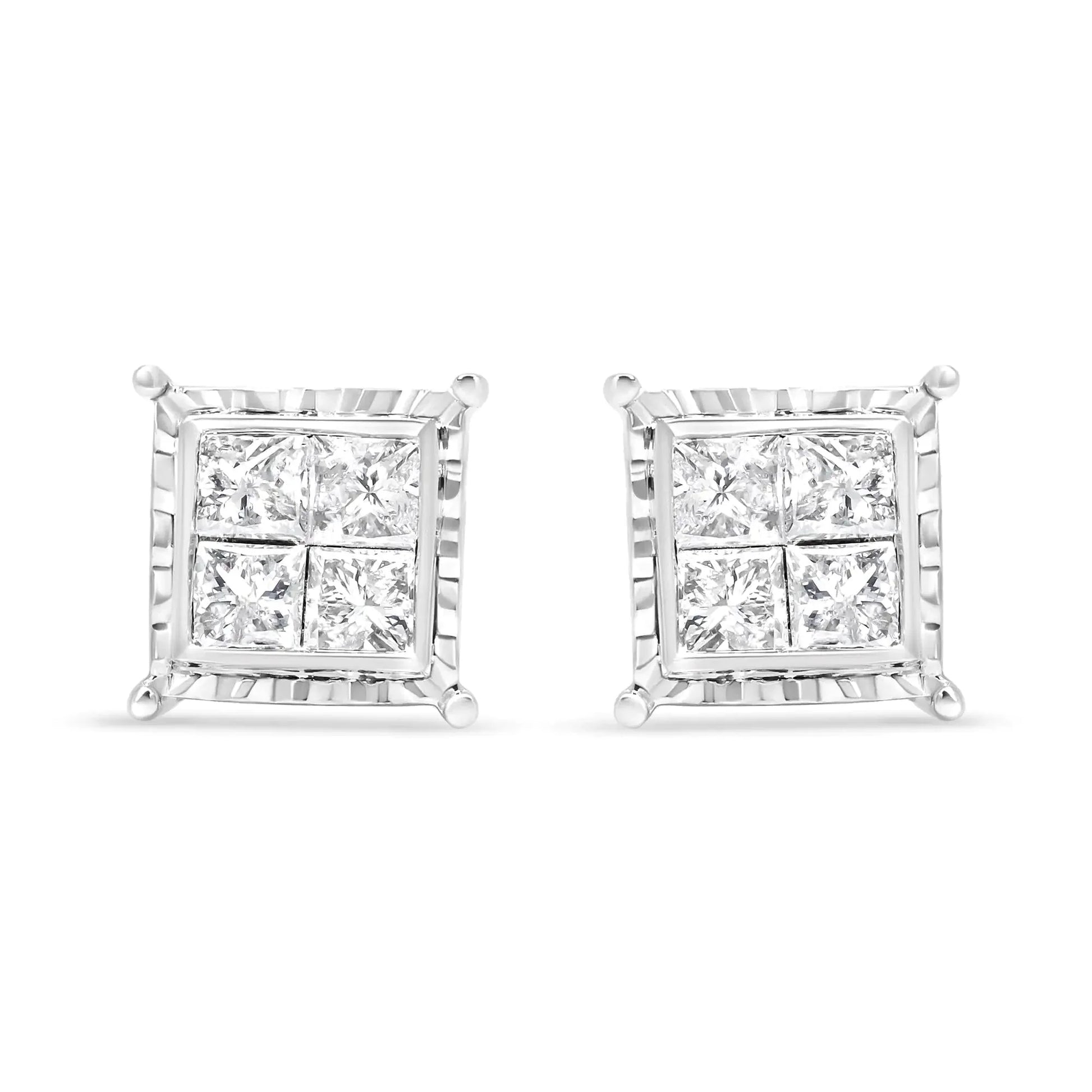Experience the alluring sparkle of these quad stud diamond earrings. These attractive 14k white gold studs behold a striking contemporary silhouette in a geometric square shape with a wavy metalwork frame that graces your ears in modern grace. Each earring holds four princess-cut diamonds secured in a wondrous invisible setting that gives full glory to the sparkle of the stones. These captivating diamonds total 1 1/2 cttw with an approximate I-J Color and I1-I2 Clarity. This pair of pierced earrings secure with push back findings.