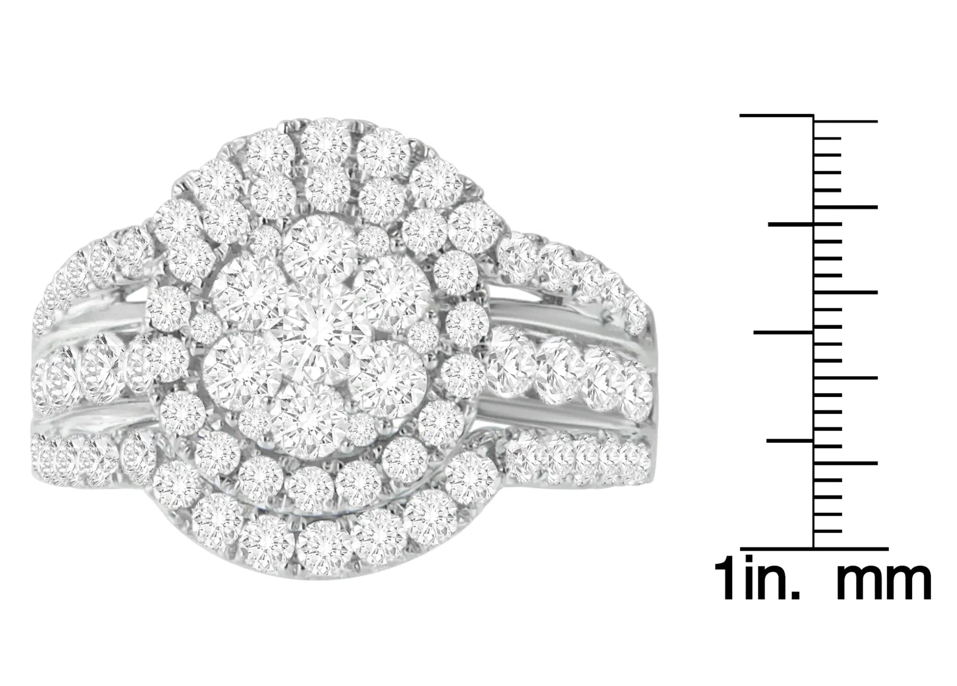 Breathtaking and elegant, this 14-karat white gold engagement ring features a unique, vintage design. The center of the ring displays a cluster of round cut white diamonds, arranged like a flower. The setting is haloed by a ring of round cut white diamonds. The diamond encrusted shank splits, then wraps around the main setting, creating a second halo. A row of channel set diamonds runs down the center of the band, adding texture and sumptuous style to this gorgeous ring.