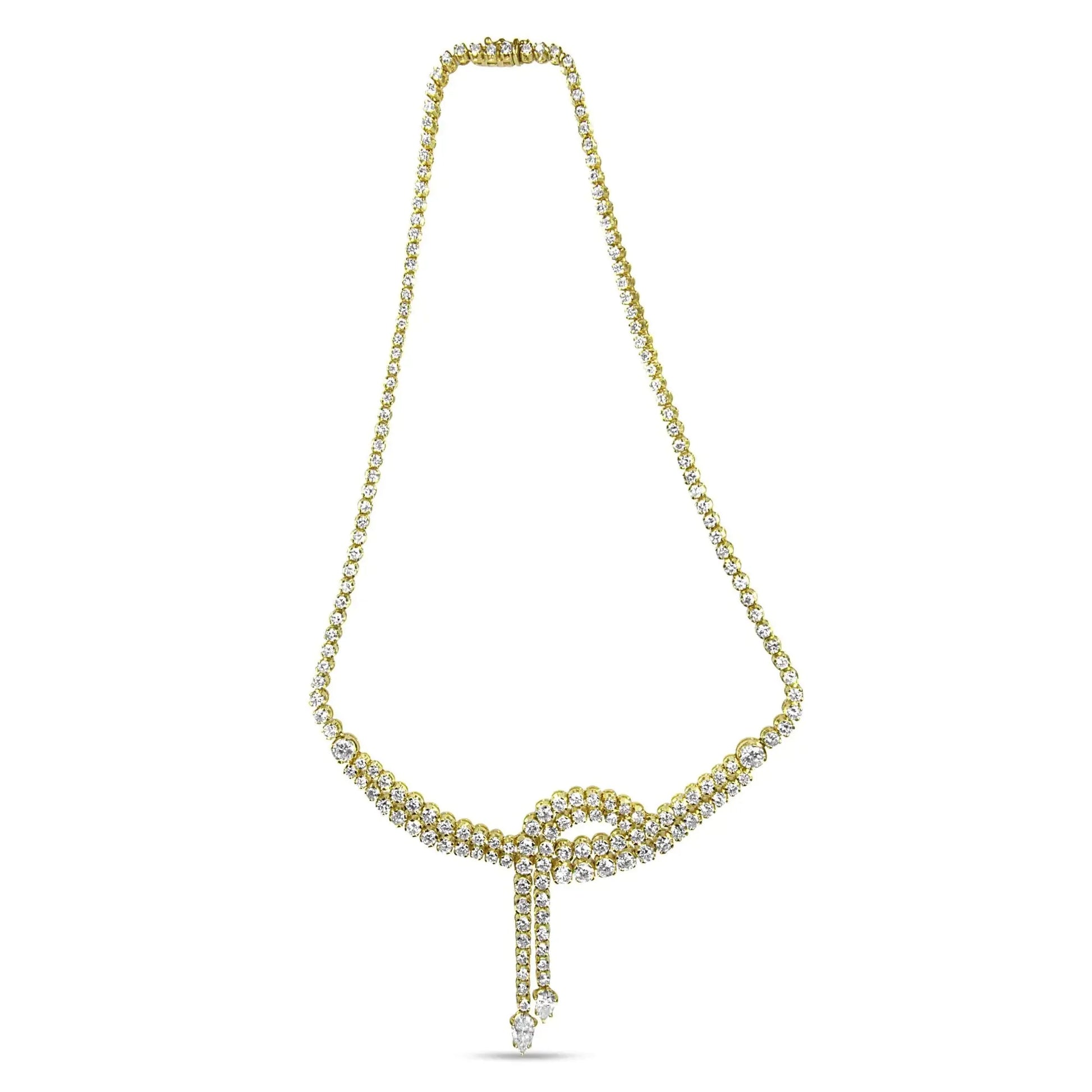 Adorn your neckline in radiant rows of luxurious natural diamonds! This lariat tennis necklace is an absolutely evocative design, enduringly elegant and boasting brilliant sparkle with over 200 diamonds that glitter and shimmer with your every move. Regal curves create a mesmerizing statement piece that loops and drapes to illuminate the neckline and your favorite formalwear in stunning style! This drop shaped necklace is articulated with 17 carat total weight diamonds that are of an approximate I-J color and VS2-SI1 clarity. The brilliant array of round white diamonds are balanced by pear-shaped white diamonds that tip the look and draw the eye in sophisticated aplomb. Crafted of genuine 14k yellow gold, this 18" long necklace makes a delectable centerpiece for your décolletage, with a box clasp closure for secure wearing. This prong-set diamond tennis necklace captures a defining elegance that is a must-have for any jewelry collection and makes an exquisite gift for someone special.