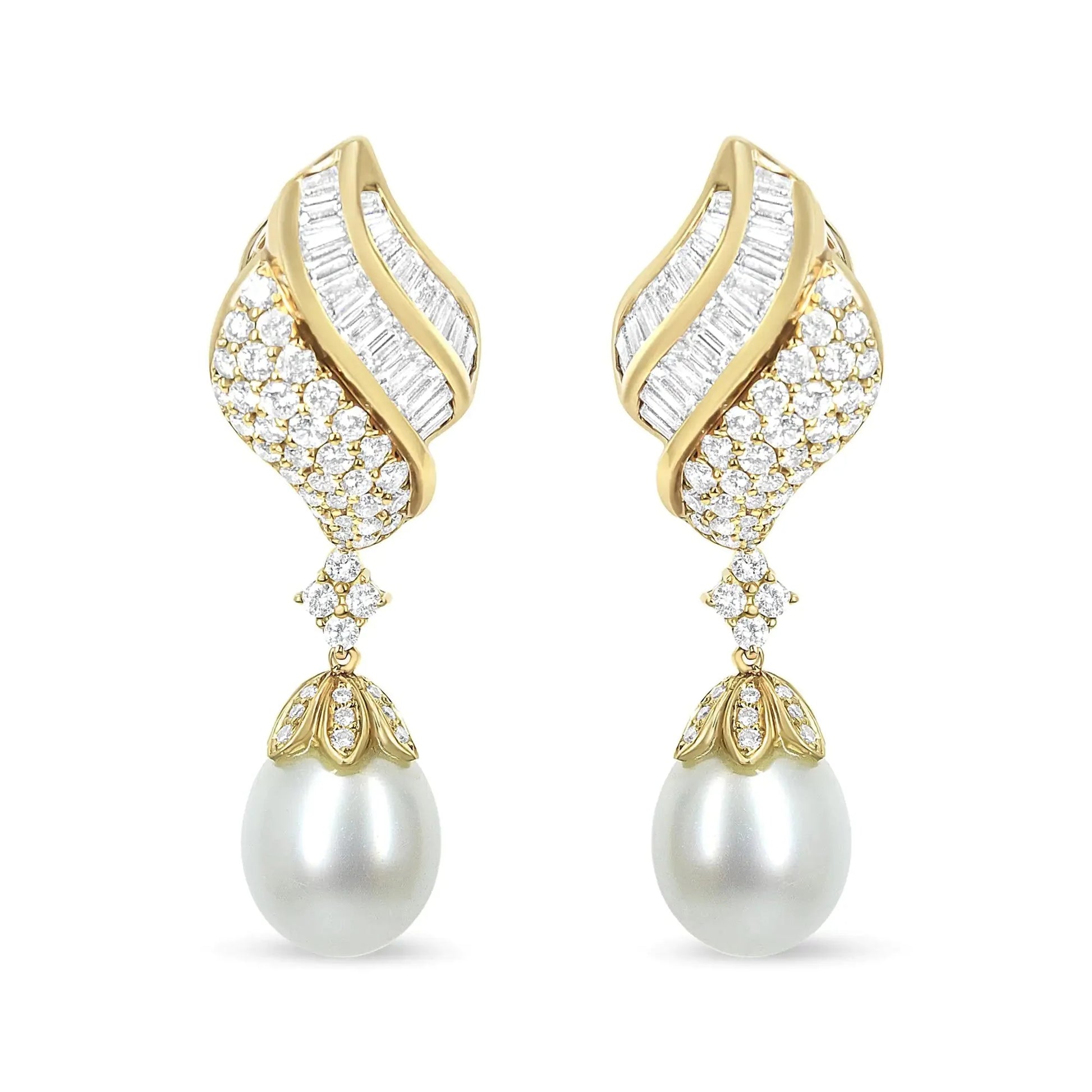 18k Yellow Gold 7.0 Cttw Baguette and Round Diamond South Sea Pearl Drop Dangle Clip-On Earrings (F-G Color, VS1-VS2 Clarity)