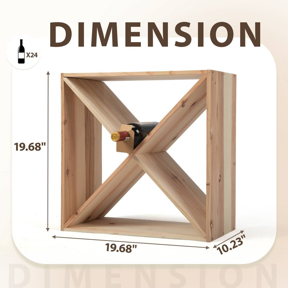 Our 24-bottle wine rack has a beautiful wood grain and a unique aroma. Besides, each modular cube can hold up to 24 bottles. It is worth mentioning that the stackable design allows you to increase storage space as your collection grows. The horizontal display way can keep the cork good and the liquor tastes mellow.