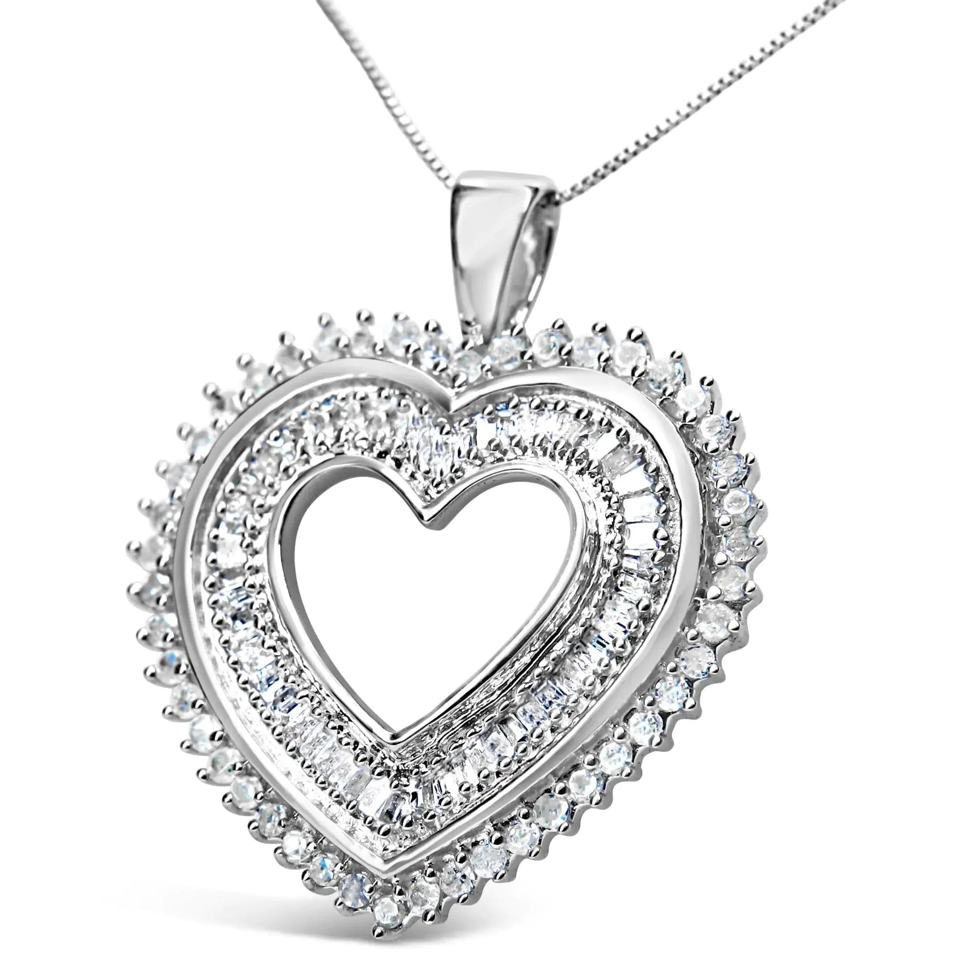 Sparkling with an impressive array of 1.0 cttw diamonds, this open heart pendant necklace for her is a beautiful illustration of love and romance. The interior of the heart is intricately lined by glittering baguette diamonds in a channel-setting, while the outer portion of the pendant balances the look with a frame of prong-set white diamonds. These diamonds are of an approximate H-I color and I3 clarity and accompanied by fine .925 sterling silver. The contemporary yet classic 18" box chain complements any neckline beautifully and secures with a spring ring clasp.