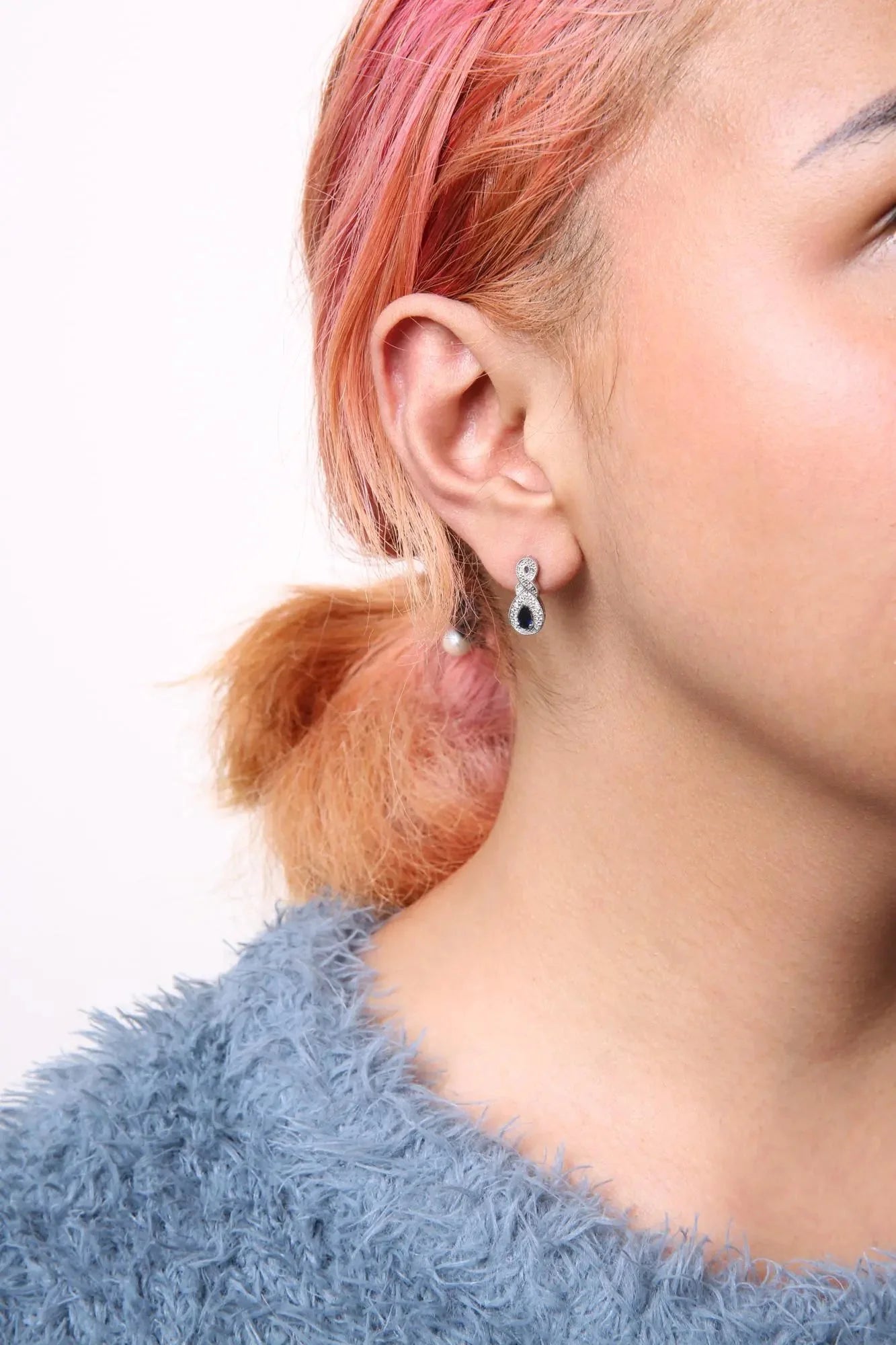 Prepare to dazzle in these stunning sapphire and diamond drop stud earrings, crafted from .925 sterling silver. Featuring two natural pear-shaped blue sapphires, each measuring 4.5 x 3mm, and accented by 14 round-cut natural diamonds, these earrings exude elegance and sophistication. The intricate prong setting of the gemstones ensures maximum light exposure, illuminating the deep blue hues of the sapphires and the sparkling fire of the diamonds. The diamond count of 14 and total weight of 0.05 cttw, coupled with the H-I color and SI1-SI2 clarity, make these earrings an excellent investment for any jewelry collection. The push-back earring finding ensures comfort and security, allowing you to wear these earrings with confidence all day or night. The infinity drop design adds an extra touch of glamour, making these earrings the perfect choice for any formal event or special occasion.