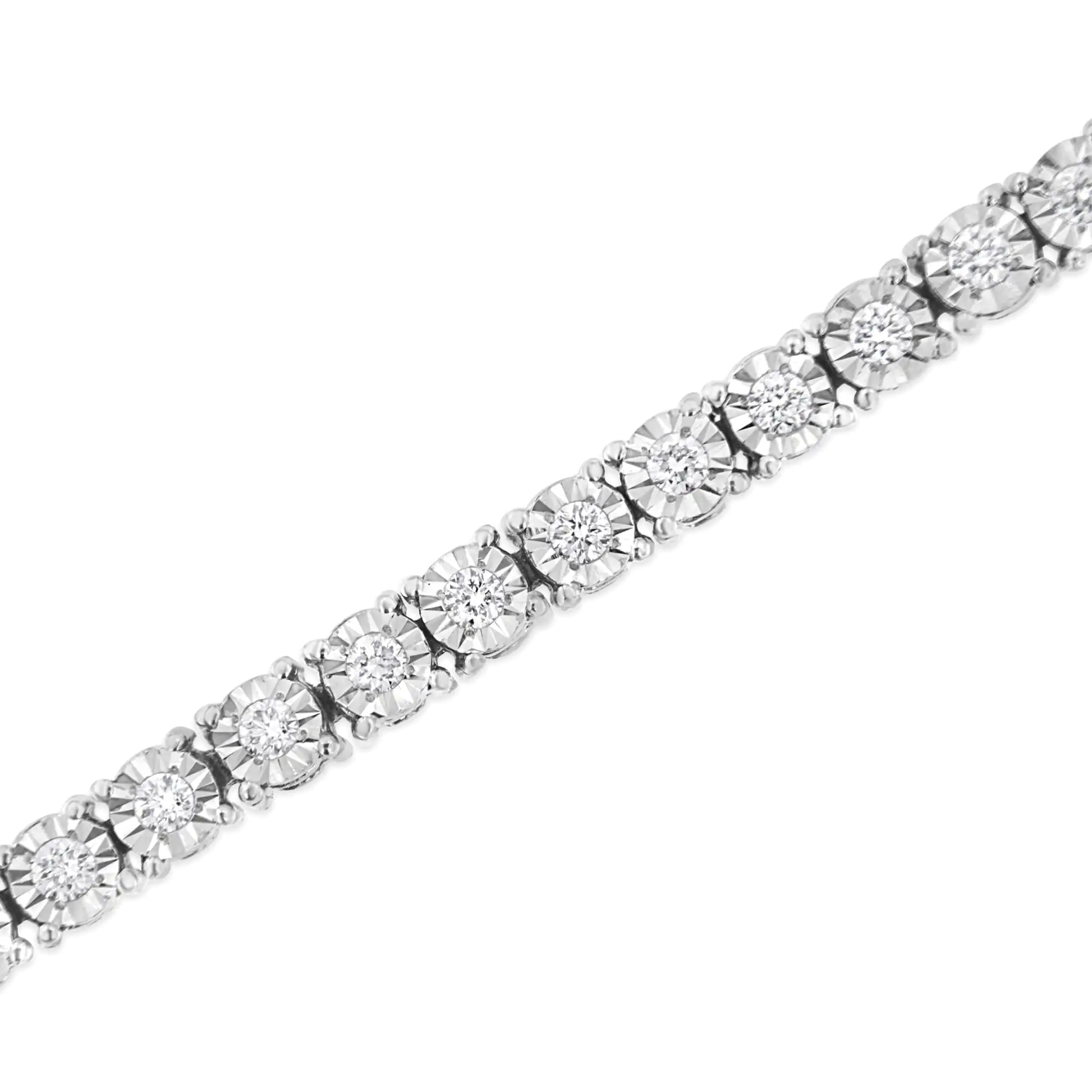 Elegant and timeless, this gorgeous pure 92.5% sterling silver tennis bracelet features 1, 2, or 3 carat total weight of round lab-created diamonds. The illusion-setting of this bracelet features unique miracle plates that center each diamond in a mirror-finish, high-polish frame. Modern yet antique-inspired faceted bezel settings give the illusion of much larger stones, magnifying the sparkle. This 7.25" bracelet has a box-with-tongue and safety clasp fastener and is crafted of real 925 sterling silver that has been electro-coated with genuine rhodium (a platinum-family metal), ensuring it will keep a tarnish-free shine for years to come. This sweet bracelet makes a perfect Valentine's Day gift, or as a way to remember someone close to your heart. It's a classic and feminine piece she'll want to show off every day. Whether worn for daytime glamour or evening sparkle, this bracelet is gorgeously versatile. Give her a gift that will perfectly complement almost any ensemble.