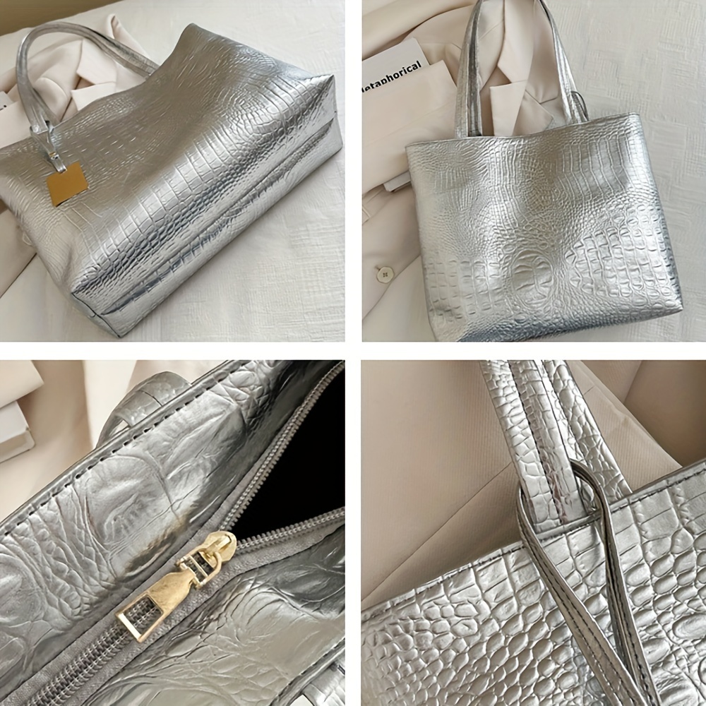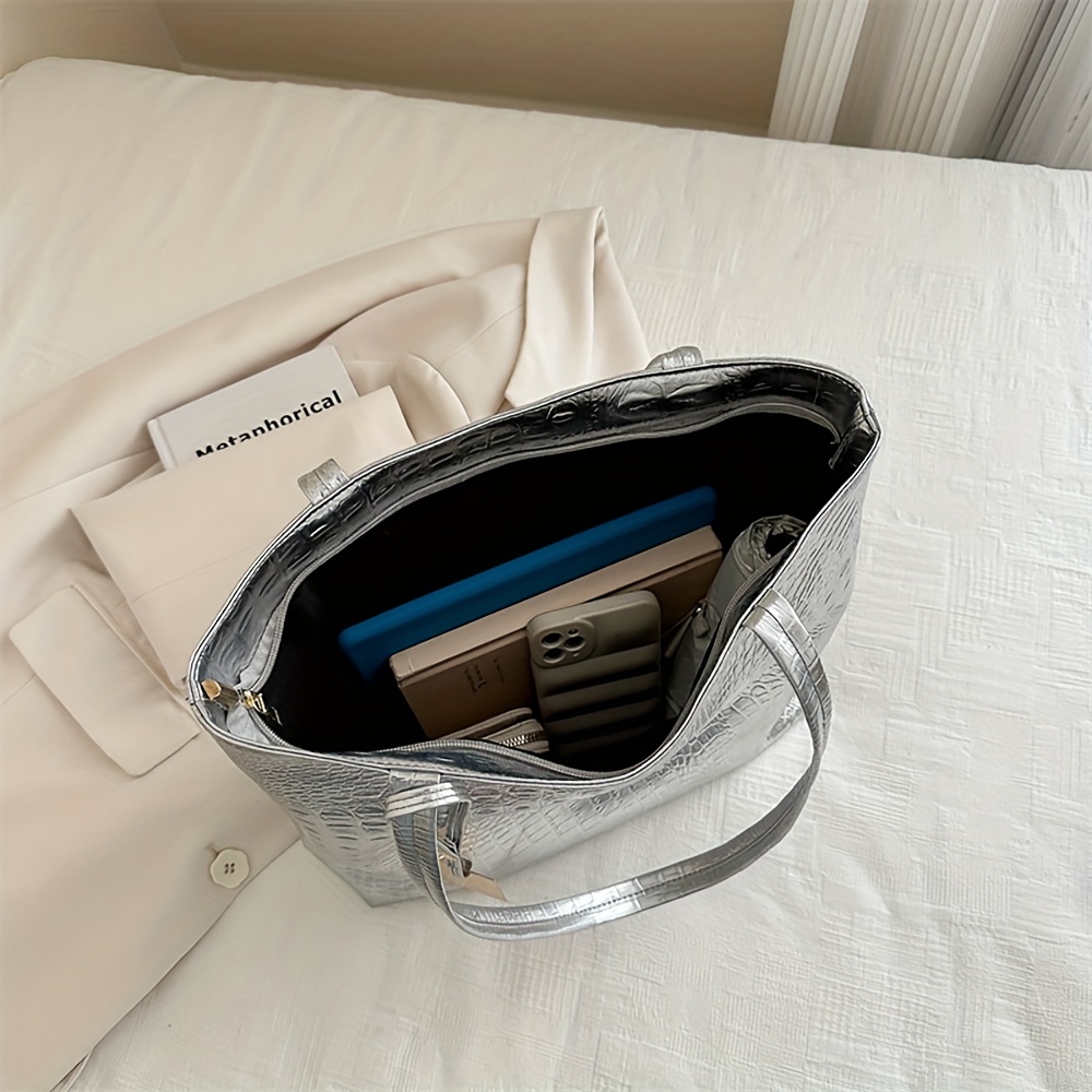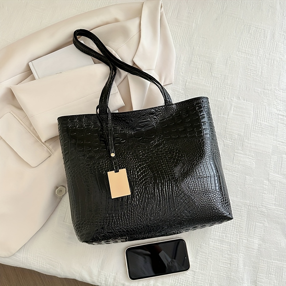 Lightweight, Business Casual Large Capacity Tote Bag, PU Double Handle Shoulder Bag, Women's Fashionable Commuter and Work Handbag with Crocodile Pattern Detail Shoulder Handbag