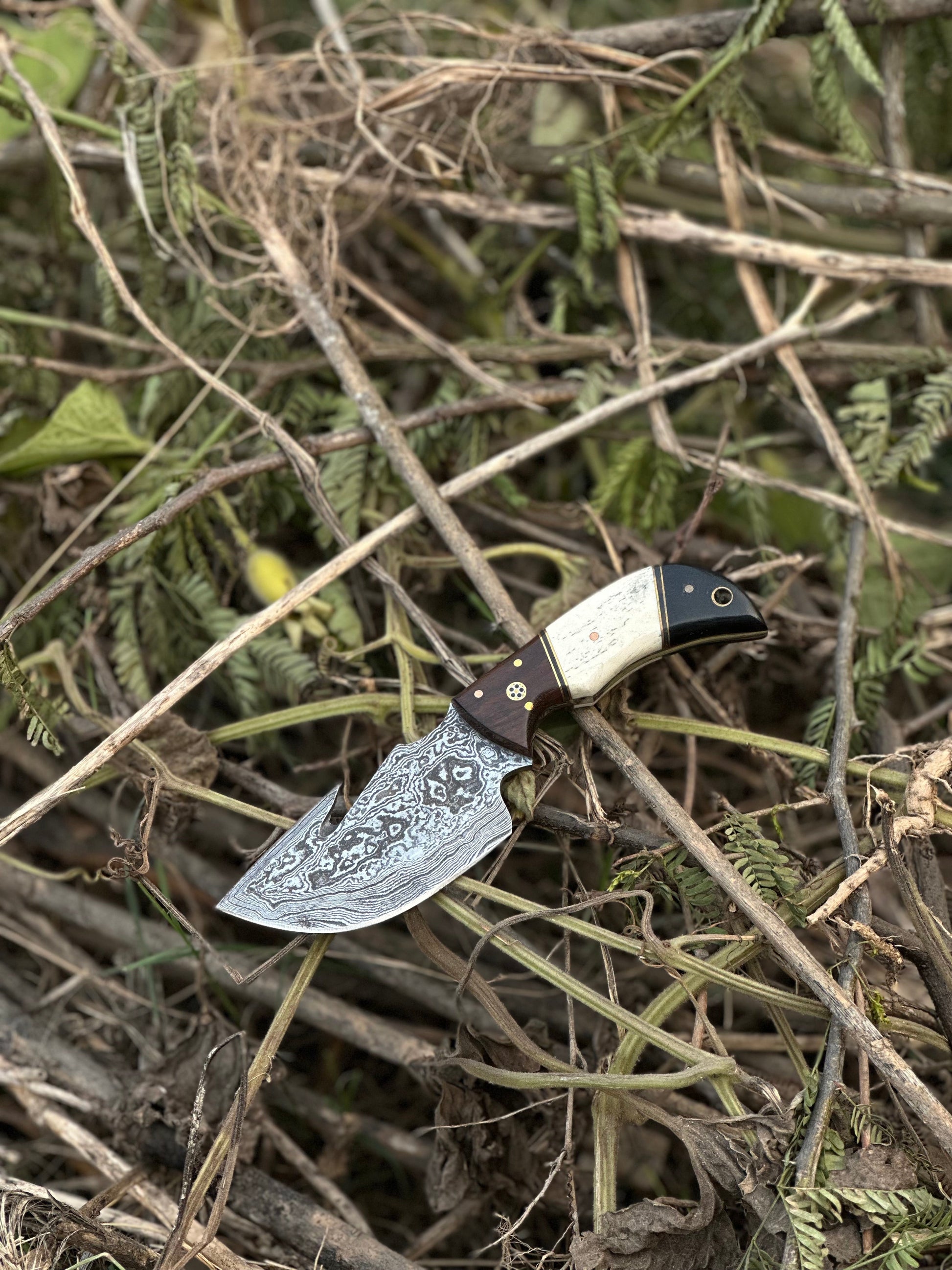 Elevate your outdoor gear with our custom handmade Damascus steel guthook skinning knife, featuring a unique handle crafted from rosewood, camel bone, and black sheet. Measuring 7.5 inches in overall length, this knife is designed for precision and durability, making it an essential tool for hunters and outdoor enthusiasts. The Damascus steel blade ensures exceptional sharpness and strength, while the combination of materials in the handle offers both style and comfort. Complete with a custom leather sheath, this knife is not only practical but also a perfect gift item for those who appreciate fine craftsmanship.