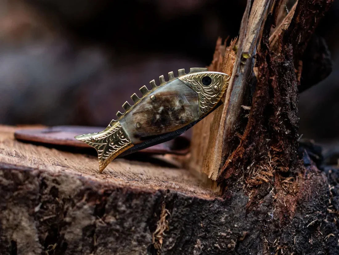 Elevate your knife collection with our custom handmade fish style Damascus steel folding knife. This exquisite knife features a distinctive fish-inspired blade and a handle crafted from premium sheep horn with brass accents. The Damascus steel blade ensures exceptional sharpness and durability, while the sheep horn handle provides a unique aesthetic and comfortable grip. Complete with a handcrafted leather sheath, this knife is not only a functional tool but also a perfect gift item for collectors and outdoor enthusiasts.