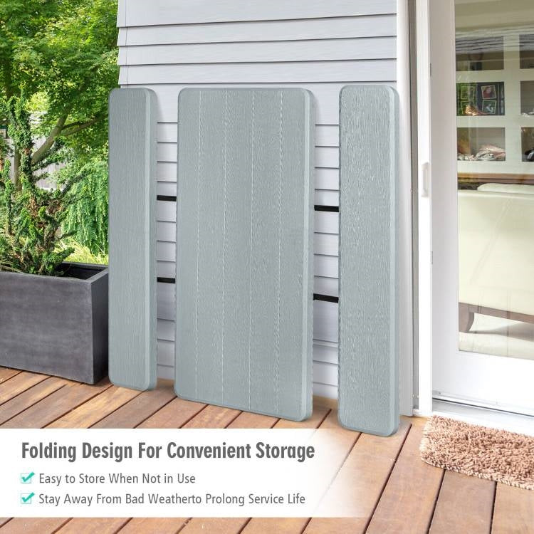 Measuring 54" x 28"(L X W), this Grey Folding Picnic Table with 2 Benches Outdoor Patio Dining Set features a large desktop to support all kinds of food and tableware needed for picnics. The bench is long enough to accommodate 4 adults or 6 children at the same time without being crowded. It's ideal for family parties or camping trips. The folding camping table has a thoughtful folding function, which occupies less space, allowing you to store it indoors to keep it away from bad weather. The transformation of the table is quite simple. Anyone can easily transform it from a folded desk to a picnic table in just 5 steps. The frame of this picnic table with bench set is made of thickened rustproof steel pipes, so it is durable and robust enough to company with you for a long time. The elegant wood grain desktop is made of HDPE. It's waterproof and wear-resistant, and can be easily cleaned. This folding table is designed for multi-purpose use, particularly suitable for a variety of indoor and outdoor uses. For example, it can work as a BBQ dining table, game table, camping table, picnic table, study table, etc. No matter where you need a table, this folding table can be a correct solution. The folding picnic table has few parts, which are individually packaged to prevent them from getting lost. All installation tools are included. Follow the detailed instruction step by step, you can put it together or tear it down within a few minutes.
