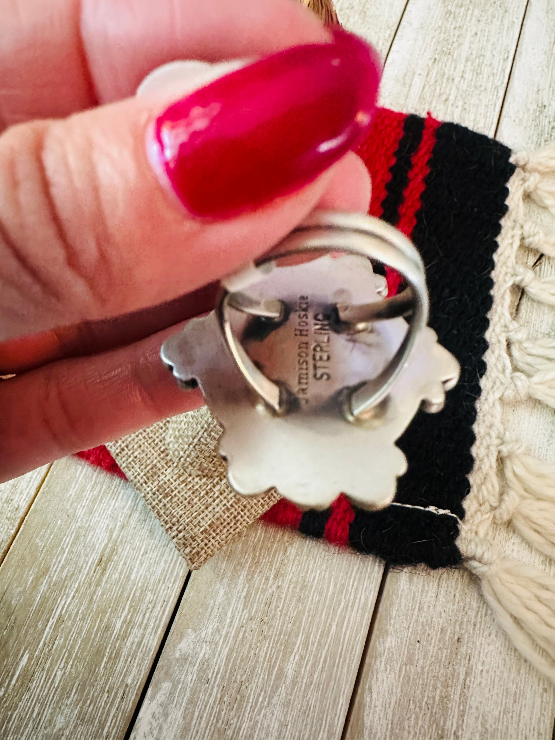 Beautiful Handcrafted Sterling Silver and Blackjack Turquoise Ring. Size 7.5. Measures 1 1/2 inches wide. Signed by the artist Jamison Hoskie and stamped Sterling.