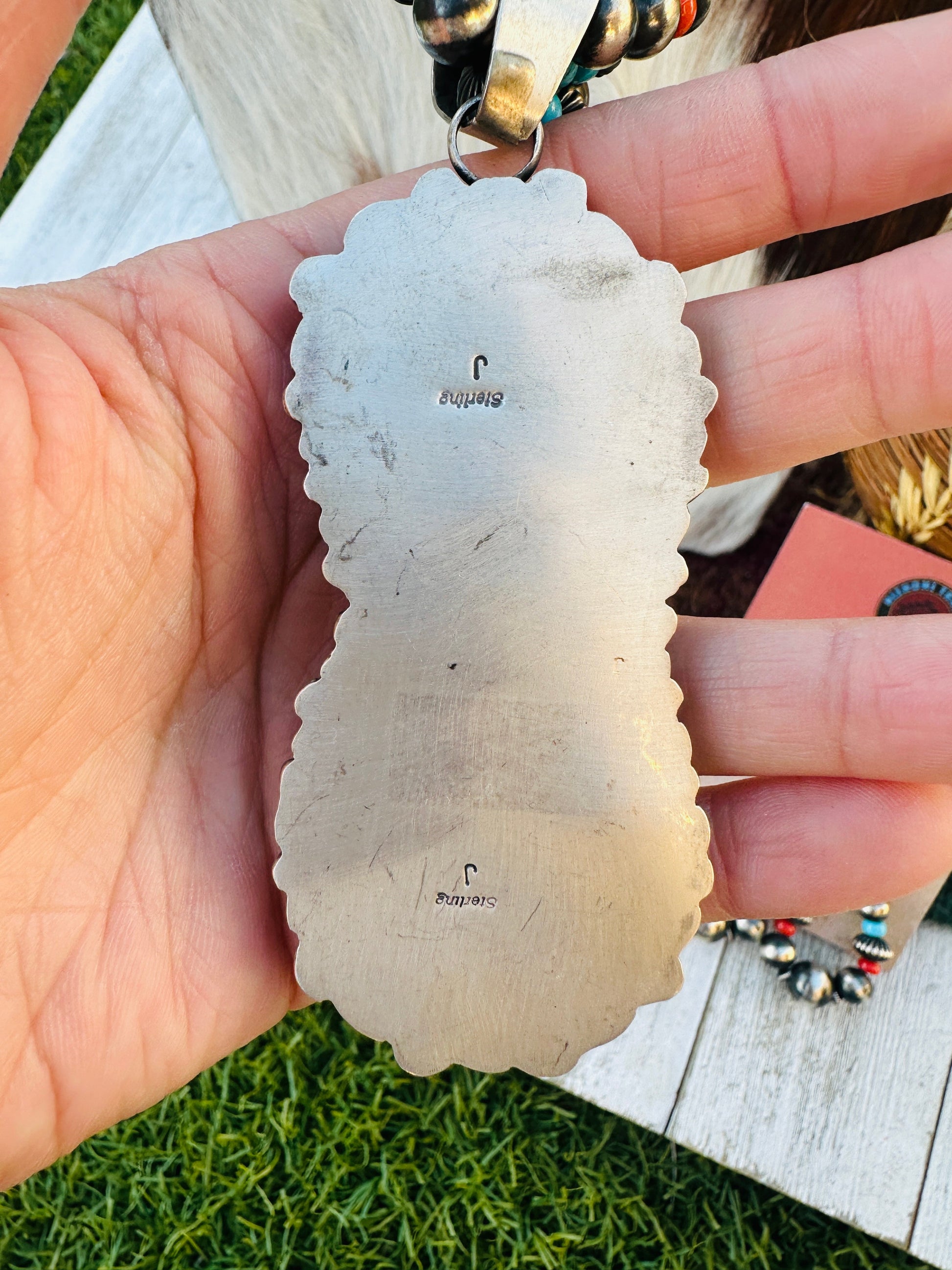 Beautiful Old Pawn Handcrafted Turquoise, Spiny Oyster Shell and Sterling Silver Beaded Necklace and Earrings Set. Beads measure 18 inches long with 4 inch extender. Pendant measures 4 1/4 inches long and 1 3/4 inches wide. Matching earrings measure 2 1/4 inches long and 7/8 of an inch wide. Signed by the artist and stamped Sterling. Such a gorgeous set!