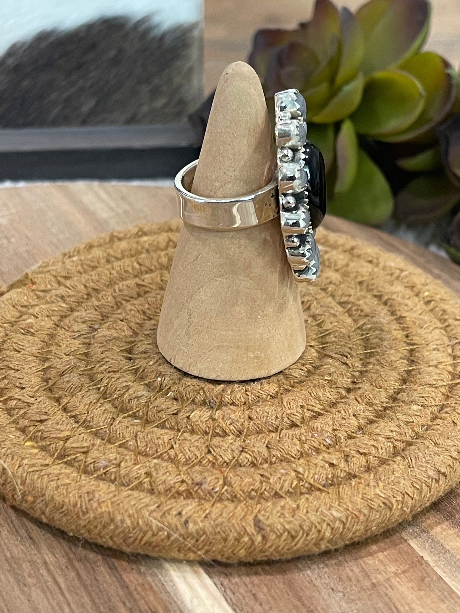 Handmade Sterling Silver, Onyx & Moonstone Cluster Adjustable Ring