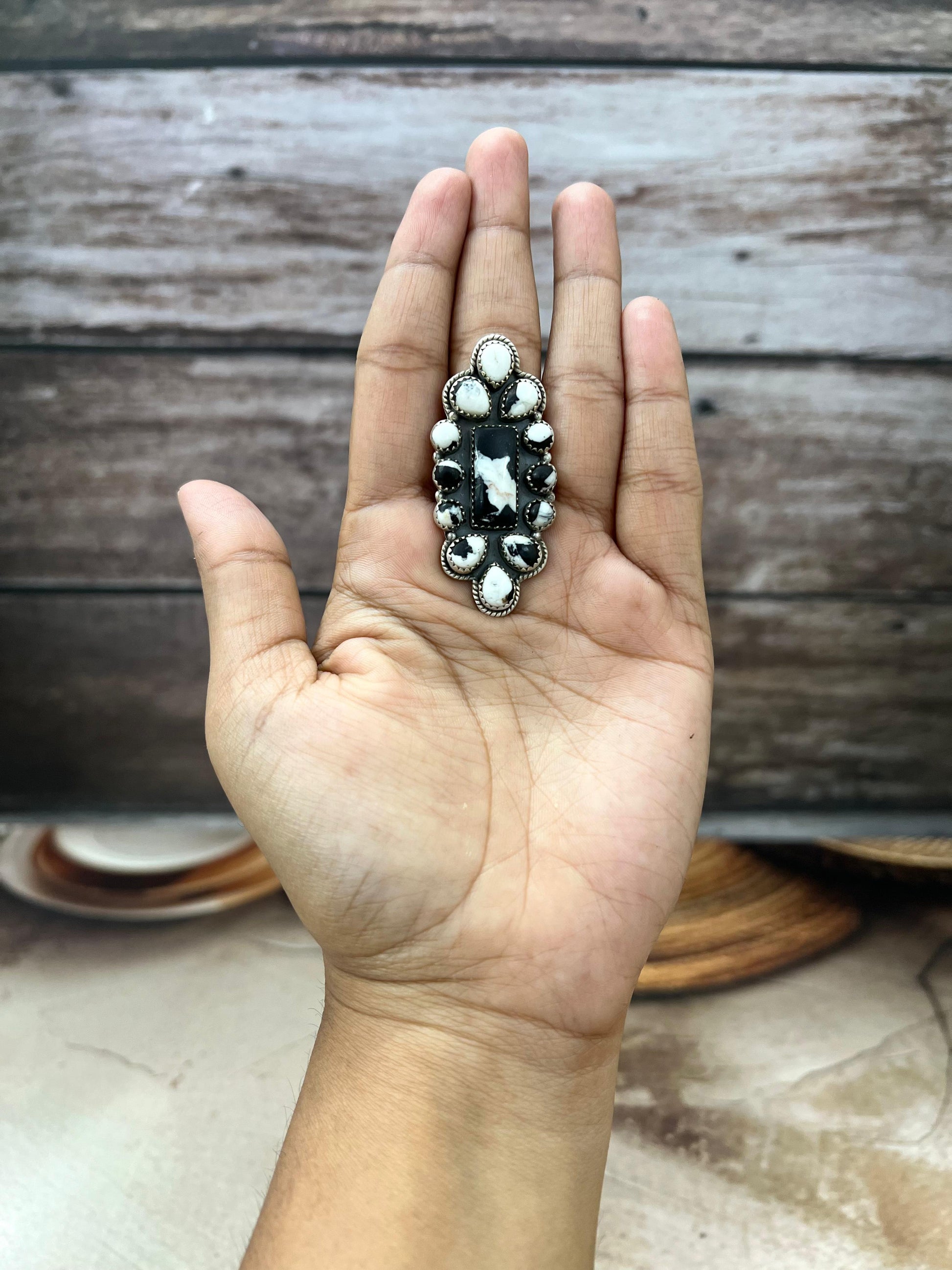 Introducing our latest masterpiece! This stunning Sterling Silver White Buffalo adjustable ring is a true showstopper. With dimensions of 2" in length and 1" in width, it’s designed to make a bold statement.