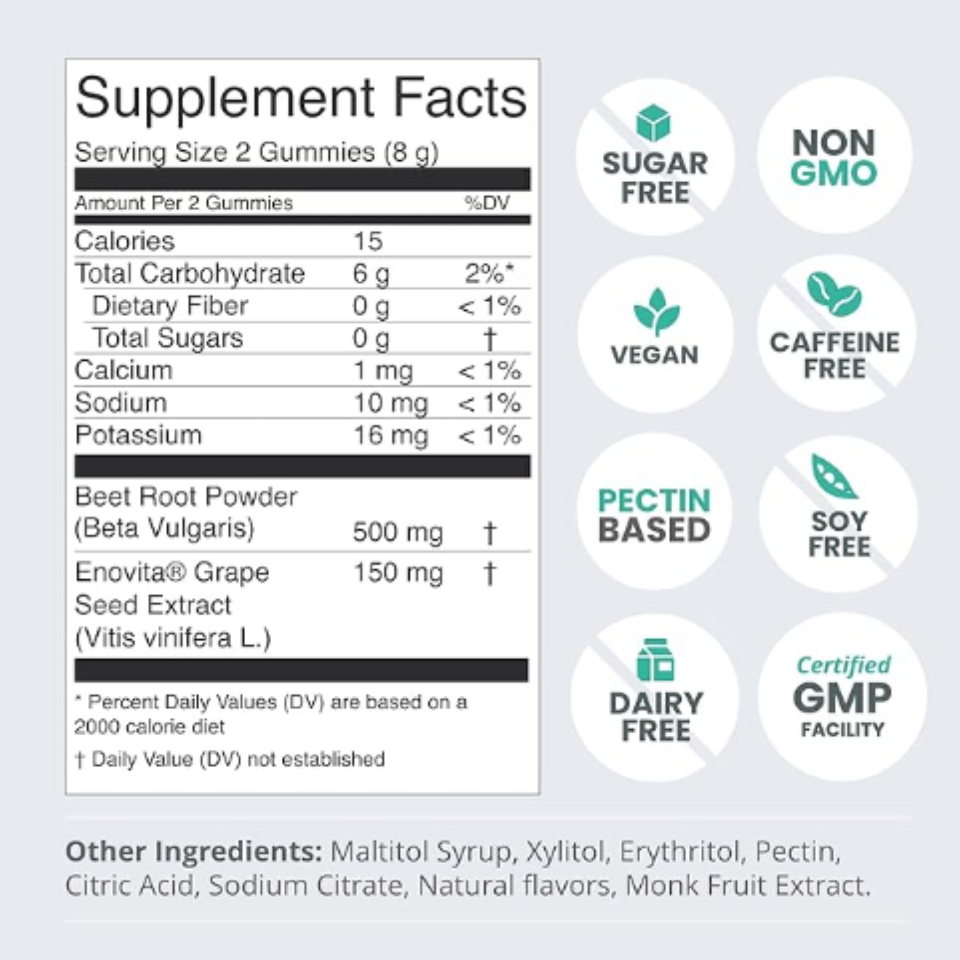 - Main Ingredients: French Grape Seed Extract, Beet Root Powder