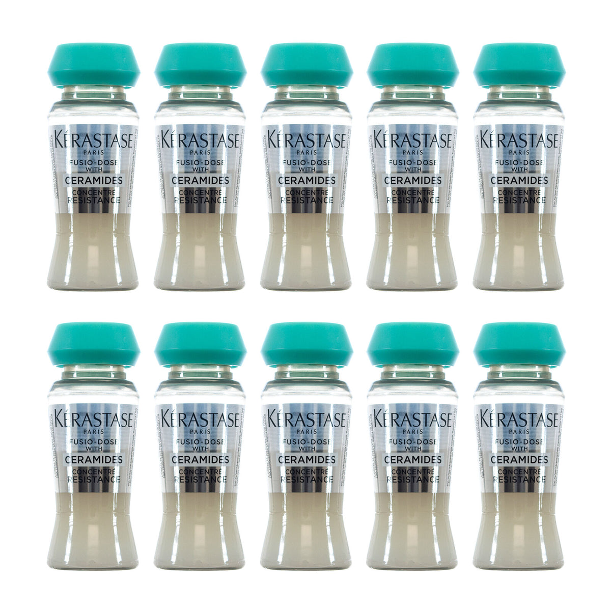 KERASTASE FUSIO DOSE CONCENTRE RESISTANCE Intensive Reinforcing Care for Damaged, Over-Processed Hair Size: 10x12ml / 10x0.4fl.oz.ml Kerastase Fusio-Dose Concentre Resistance is a part of the Fusio Dose family of professional hair treatments designed to resolve concerns in damaged and weakened hair. It is enriched with highly concentrated active ingredient Ceramides to repair the damage done by heat styling tools or environmental aggressors by infusing hair fiber with a nourishing dose of goodness and sealing the outer layer of the hair cuticle to prevent future breakage. It instantly strengthens the hair and transforms it into more nourished, softer locks with high shine and less surface damage. Kerastase Fusio-Dose Concentre Resistance is meant to treat damaged hair as the main concern and must be combined with the Kerastase Fusio Dose booster of your choice that activates the treatment and at the same time addresses a secondary hair concern. The beauty of the Fusio-Dose is that you can create a tailor-made solution based on your hair needs and combine different hair treatments into ONE by mixing the concentrate with different types of boosters to address your hair needs. The freshly fused treatment with an initial dose of goodness will fundamentally treat your hair and immediately transform it for lasting results.
