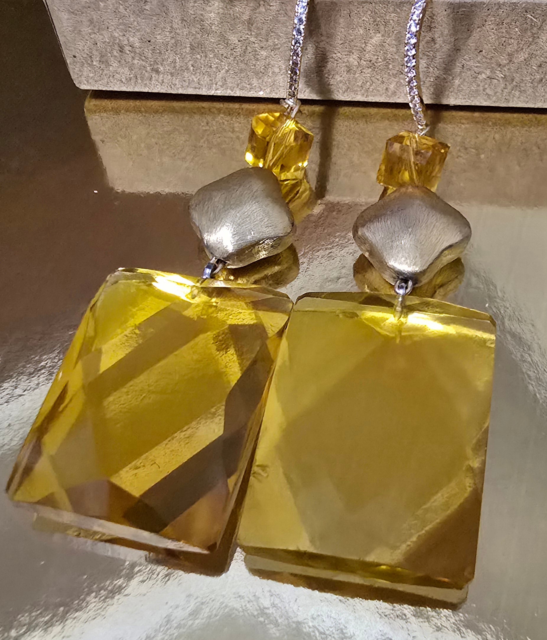 Do you love authentic natural gemstones made into jewelry ? Well we do too! Like this genuine citrine diamond drop earrings. The stone is unheated and treated , its the most purest form carved into different shapes, so yes, you can get these earrings in different shapes. Also made with genuine gold brushed over antique silver shaped into a clover. The hooks are 14k gold filled with cz pave` crystals along the curves. They are also hypoallergenic free.