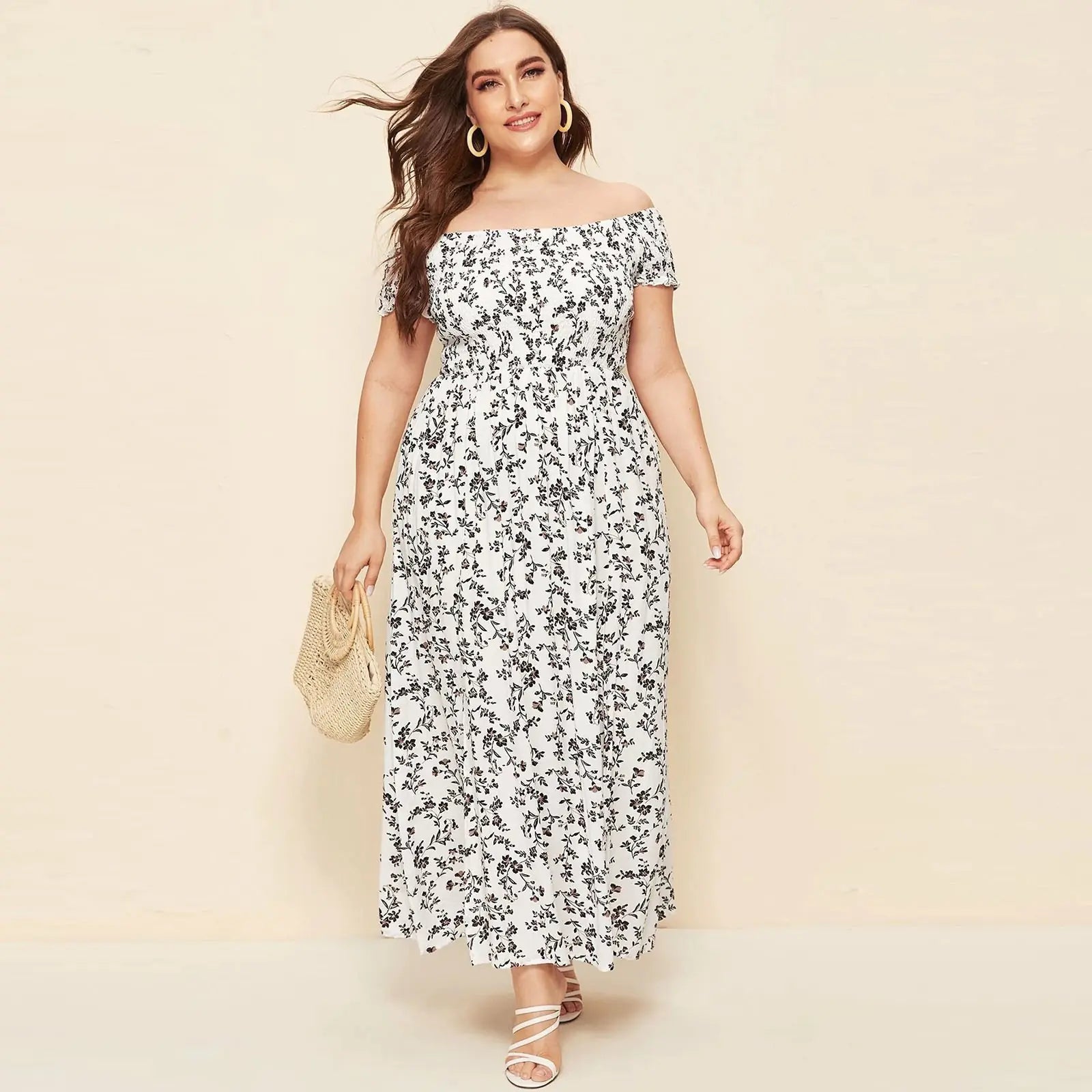 Plus Size Floral Print Off-Shoulder Summer Dress