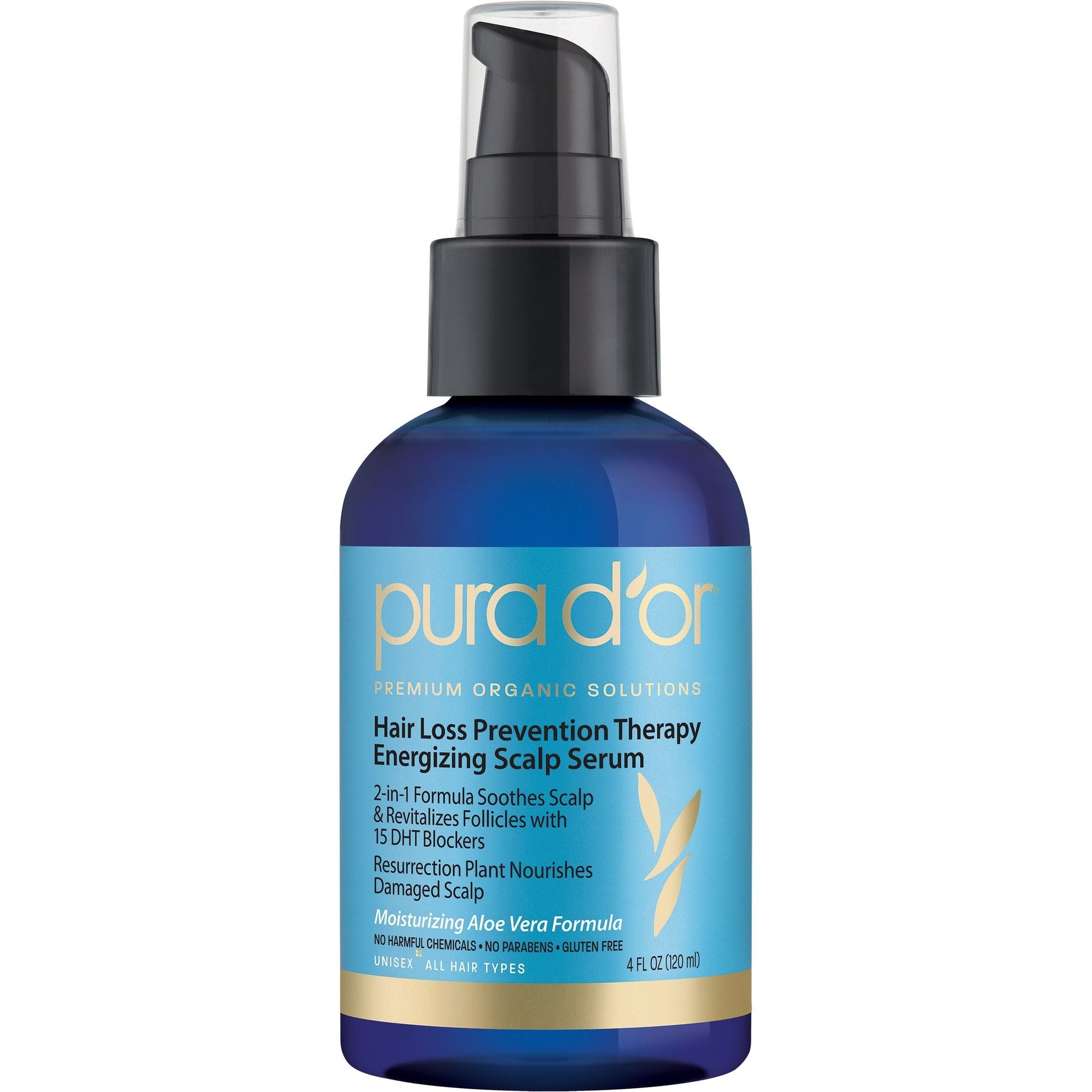PURA D'OR Hair Thinning Therapy Energizing Scalp Serum 4oz is an intense treatment that nourishes the scalp and strengthens hair. Exclusive formula delivers 15 key active ingredients specifically developed to maximize the results of the Hair Thinning Therapy system. Caffeine, Catalase, and Cayenne invigorate the scalp, while Apple Fruit Stem Cell and Pea Protein Extract increase hydration and help protect strands from future damage. Free from harsh chemicals, environmentally responsible, hypo-allergenic, vegan and cruelty free.