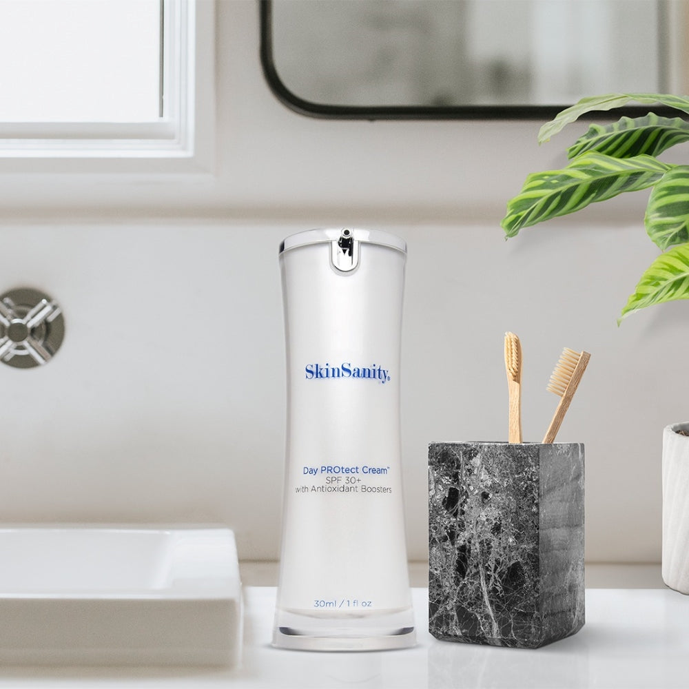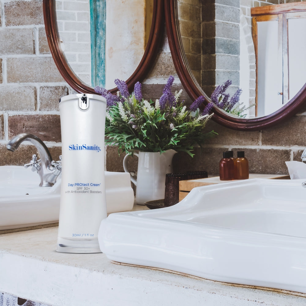 SkinSanity® Day Protect Cream SPF 30+ with Antioxidant Boosters. A luxurious broad spectrum super, age-defying, moisturizer with SPF 30 sunscreen for your face—because we all know that sun protection is the most important anti-aging ingredient. This little beauty includes a proprietary mixture of antioxidants, anti-irritant and anti-inflammatory agents, to defend cells against accelerated aging. This product is very concentrated, and if desired, you can thin with any of our serums. All our clean beauty products are vegan, cruelty-free, made with organic and natural ingredients, gluten-free, and great for the planet.