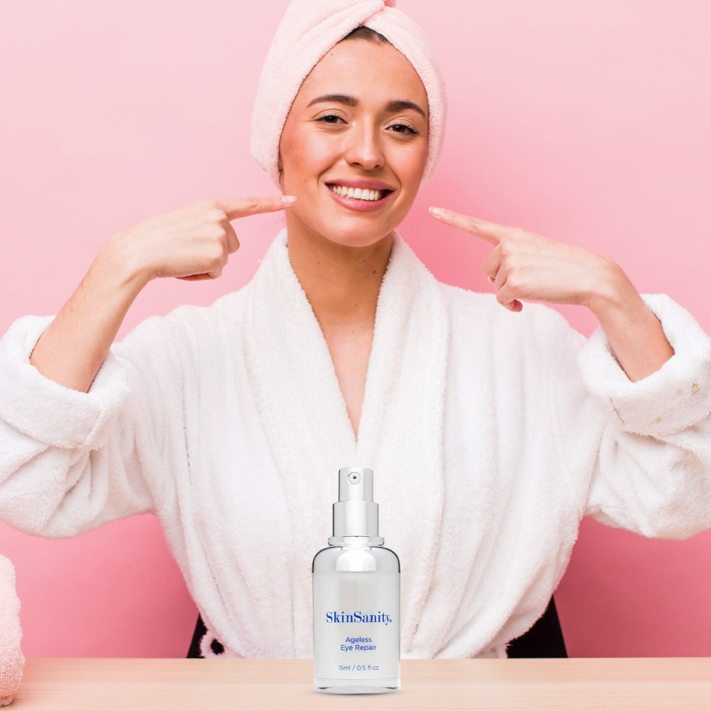 SkinSanity® - Ageless Eye Repair. - Clinically proven botanical actives that address fine lines, puffy eyes, dry skin, and dark circles to revitalize the eye area. Two Marine algae polysacchardes help reduce dark circles and eye puffiness and hyaluronic acid nourishes delicate skin tissue improving the appearance of fine lines, skin elasticity, and resiliency. Sodium hyaluronate, certified organic aloe vera, and organic glycerin from Karanja nut oil provides moisturization and hydration. Our clean beauty products are vegan, cruelty-free, made with organic/natural ingredients, gluten-free, and planet-friendly.