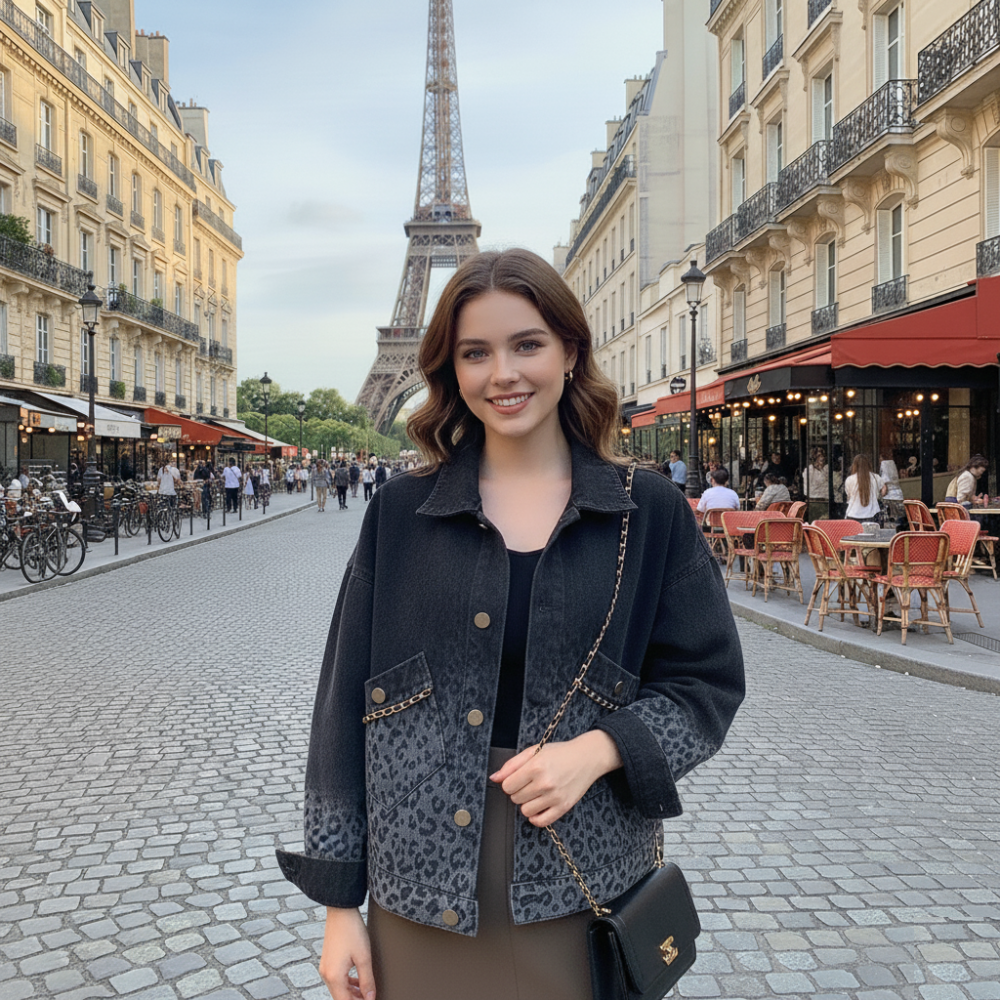 Stand out with its unique leopard print design, adding a bold yet stylish touch to any outfit. Available in blue and black, it effortlessly combines classic denim with modern flair for a trendy look.