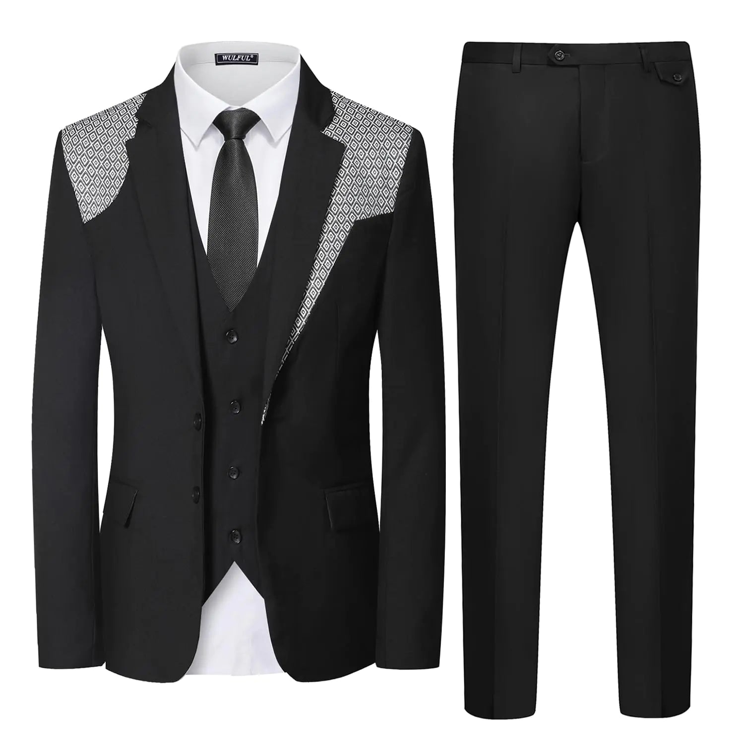 WULFUL Men's 3 Piece Slim Fit Suit Set Two Button Blazer Jacket Vest Pants Tuxedo Set for Party, Wedding and Business Medium Black-0371